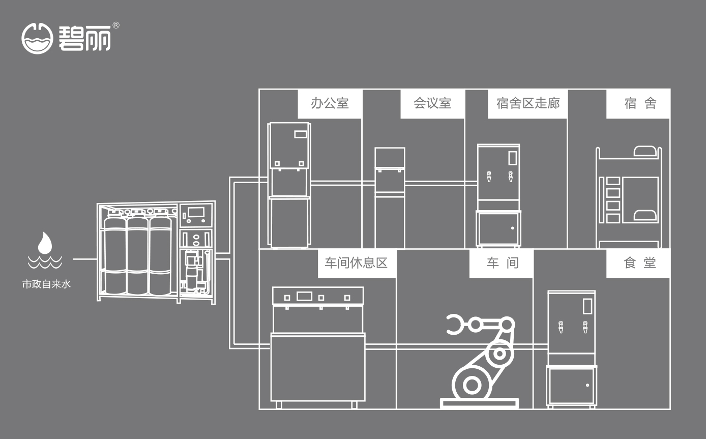 碧丽商用反渗透纯水机将自来水集中处理后,把优质的纯净水通过专用的供水管道输送到各饮水点;